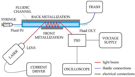 The instrumental configuration for the contactless sensing of fluids is shown in Figure 1. The red radiation provided by a semiconductor laser diode (DL3147-060, Sanyo, Japan) is shone on a disposable plastic micro-channel at an angle of approximately 45° and it is focused using a lens (LTN330B, Thorlabs, NJ, USA) to obtain the smallest light spot onto the active surface of a 1-D Silicon Position Sensitive Detector. The PSD (1L10SU74-SPC02, by SiTek Electro Optics AB, Partille, Sweden) is powered with a ±15 V voltage supply and provides two output voltage signals: the difference signal V1 − V2 and the sum signal V1 + V2. The V1 and V2 are proportional to the currents that are photogenerated at the extremities of the sensitive region that has length LPSD = 10 mm. The light spot position pPSD on the PSD, with respect to the center of the sensitive area, can be retrieved by computing the formula: