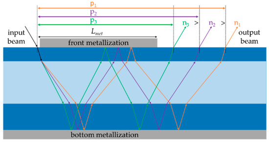 When fluids with different RIs are tested, the light beam always exits the channel with the same output angle (that is equal to the incidence angle), but its exit position along the fluidic device surface does change. For increasing values of the RI, it is moved closer to the incident input beam and the value of p decreases, as shown in Figure 2, where a schematic representation of light traveling inside the channel in case of a number of bounces equal to N = 2 is reported. If the orange, purple, and green lines correspond to the paths of light when the channel is filled with a sample with an RI equal to n1, n2, and n3, respectively, and n3 > n2 > n1, then p3 < p2 < p1. The number of bounces N depends on the length of the front metallization Lmet and it is given by: