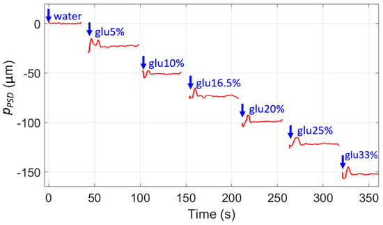 Experimental measurements were carried out in the so-called “multiple bounce configuration”. Thanks to the presence of the double metallization, the displacement of the output beam can be strongly enhanced. The number of bounces N was estimated to be equal to 3 using Equation (2). For the experimental characterization, the channel was filled with distilled water and mixtures of glucose in water in concentrations equal to 0%, 5%, 10%, 16.5%, 20%, 25%, and 33%, corresponding to RI values n = 1.3314, 1.3386, 1.3459, 1.3553, 1.3604, 1.3676, and 1.3792 RIU, respectively. Figure 3 shows the experimental variation of the beam position pPSD detected by the PSD as a function of time when water and water–glucose solutions with different concentrations are tested. The system was aligned so that the reflected beam in the presence of water into the channel reaches approximately the center of the active area of the PSD (i.e., pPSD equal to zero). When the RI of the liquid inserted into the channel increases, the absolute value of the displacement increases as well, with respect to the value of the signal acquired in the presence of water.