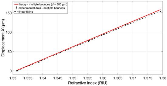 By linearly fitting the theoretical and experimental displacement X as a function of the liquid RI, it was possible to obtain both theoretical (red trace) and experimental (black trace) calibration curves (Figure 4), that were found to be in extremely good agreement. The theoretical displacement Xth is given by Equation (3), whereas the experimental displacement Xesperim of the light beam position with respect to that measured when water (chosen as a reference fluid) flows into the channel was recovered as follows: