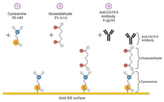 Immobilization using cysteamine and glutaraldehyde (Created in BioRender.com on 15 August 2022 (accessed on 17 August 2022)).