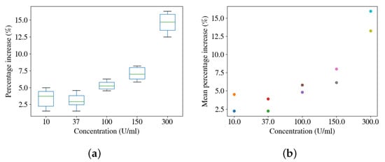 Impedance measurements after the antigen incubation period were compared to the measurements before, and the percentage change in the imaginary components of impedance and capacitance were related to the presence of various concentrations of the CA19-9 protein. Furthermore, the frequency range was narrowed to the optimal four frequencies, between 700 Hz and 1000 Hz. This allowed for increased accuracy in differentiation between concentrations by measuring the average real capacitance over these frequencies. This frequency range is small since a narrow bandwidth is needed to represent information about the change in the real double layer capacitance, as a result of binding events on the surface of the gold. Figure 4a shows a box and whisker representation of the real capacitance at all frequencies for all samples at their respective frequencies. Figure 4b shows the average real capacitance per electrode, where each data point represents one electrode over all frequencies. This shows an increase in real capacitance with an increase in antigen concentration.