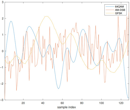 In this experimental demonstration, 64-QAM (Quadrature Amplitude Modulation), AM-DSB (Amplitude Modulated Double-SideBand transmission), and GFSK (Gaussian Frequency Shift Keying o GFSK) modulated signals have been used. These are representative of many real-world applications: 64-QAM is a typical subcarrier modulation in 5G, AM-DSB is a widely used analog modulation and GSFK is used, among others, by Bluetooth transceptors. Raw data are taken from the RADIOML 2016.10A dataset, which is one of the standards for research in this field and is publicly available at the RadioML website https://www.deepsig.ai/datasets (accessed on 1 September 2022). The dataset contains 1000 fragments or frames, all composed of 128 samples, of in-phase and quadrature components for each modulation type, although for simplicity only the in-phase components will be used in the experiments. Figure 1 shows some randomly chosen waveforms.