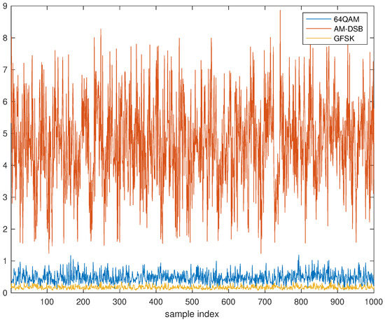 Figure 2 shows the squared norm of the vectors for , with different colors for each type of modulation. It is seen that this procedure allows us to distinguish between 64-QAM, AM-DSB, and GFSK. Each type of modulation is amplified differently after the linear transformation (recall that the norm of all raw data was normalized to one in the pre-processing step). Furthermore, the procedure is unsupervised: the algorithm has not required any data label.