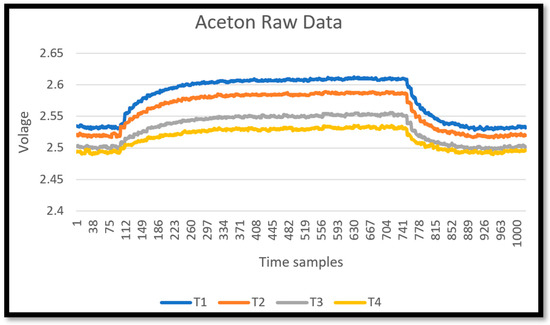 We focus on voltage measurements, where the sensing element’s voltage changes due to the chemical reaction. Contrary to the assumption that the difference between varied gases is the heat of exothermic reaction and ignition temperature, we did not look at the voltage graph of the GMOS output while igniting the gas. Rather, we looked at the voltage graph after it had stabilized, as shown in Figure 3. As a result, we could make use of additional information received by the sensor, which had not previously been used.