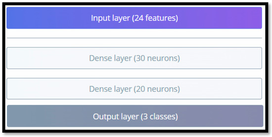 The controller sends a request to the GMOS sensor to sample data. The current data size used as an input into the TinyML system is 1 × 24. When 24 samples are collected into the controller, the data is pre-processed by the controller in the same manner that samples were pre-processed during system training. Then, features are extracted from the raw data and transmitted as an input to the neural network. The network structure is shown in Figure 4.
