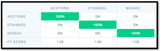 We built a full system comprising a GMOS sensor, an Arduino-nano controller, and LED bulbs, as shown in Figure 2. The system operates on the GMOS output and analyzes it using a pre-trained neural network written to the Arduino controller. Finally, the neural network outputs a classification of the detected gas, and the verdict is displayed using the LED bulbs.