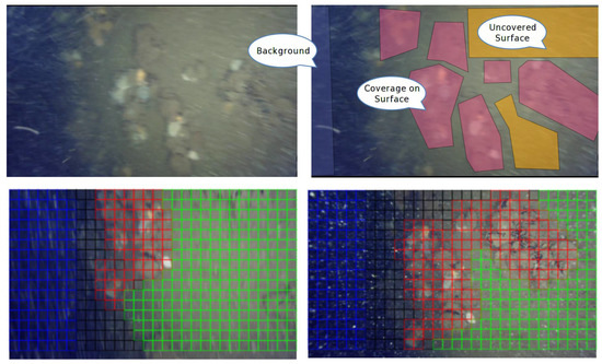 The image set consisted of different underwater images with a high variance in illumination conditions, spatial orientation, noise (bubbles, blurring), and colour palettes. The images were snapshots taken from videos recorded by a human diver. The images were used for supervised ML requiring explicit labelling. The labelling was done by hand by interactively drawing labelled closed polygon paths and assigning regions of the images to a specific class. There were remaining areas with no/unknown labelling.