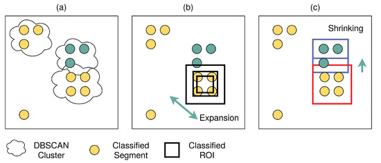 In this section, the mean bounding box (MBB) algorithm is introduced, applied after the point clustering using the DBSCAN algorithm, shown in Figure 4a. There is a set of class symbols Σ and a class matrix consisting of elements that label an image segment with a class, so that: