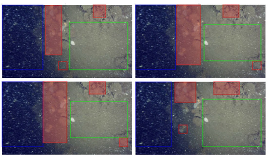 In the case of high iteration loop values, bounding boxes from different classes can overlap. To reduce overlapping conflicts, a class priority is introduced, layering the class regions by relevance. After the ROI expansion is complete, overlapping bounding boxes with a lower priority are shrunk until all overlapping conflicts are resolved (see Figure 4c). Commonly, more than one side of the bounding box can be shrunk to reduce the overlapping conflict. The possible candidates are evaluated and sorted with respect to the amount of shrinkage on each side. The lowest shrinkage is applied first. If the conflict is not reduced by the selected side shrinking, the next side is shrunk until the conflict (with one or more higher-priority bounding boxes) is reduced, as shown in Figure 4c.