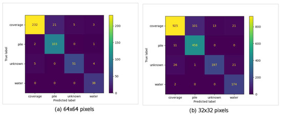 Example results (from TensorFlow model) of a four-class predictor with an additional “unknown” class U. (a) 64 × 64 pixel segment size; (b) 32 × 32 pixel segment size.