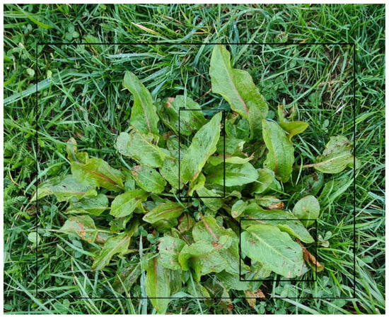 The objective of this study was to train a convolutional neural network (CNN) to achieve a high recognition rate of R. obtusifolius plants at different developmental stages and their position in a conventional pasture using a conventional RGB camera. This technology should aid the targeted control of R. obtusifolius through non-chemical methods.