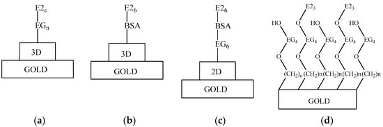 As was mentioned in the Introduction, if there are any active groups in the hapten molecule, such as –COOH, –NH, –OH, they will be coupled with a carrier and linker directly. If not, the hapten should be redesigned. The design principles of hapten molecules with respect to low-molecular compounds were proposed in [24]. Antibodies are thought to recognize part of the hapten molecule with specific characteristic. Therefore, the new structure should possess similar physicochemical properties as much as possible. Additionally, it is desirable that a linker group is allocated to the opposite position of the most distinct groups of the target molecule. Moreover, the modified hapten molecules must have an active group at the terminal of the linker. E2 molecule possesses steroid configuration with aromatic ring and two OH- groups in the 3 and 17 positions. These functional groups are likely to be the most suitable for their attachment to the substrate, i.e., carrier and linker, from a chemical point of view. At the same time, some physicochemical properties are changed, in particular at the expense of proton substitution. It should be emphasized that in the redesign of E2, changing cyclohexane, cyclopentane or aromatic rings is associated with great consumption of both chemicals and time. Therefore, we attempted to attach E2 to a linker employing the 3 position and a carrier employing the 3 or 17 position. A sensitive layer on the SPR sensor surface contains known as the recognition domain (RD) is where antibody–antigen (Ab–Ag) interaction occurs. This RD can be in 3D (Ab–Ag binding is both in the volume and on the surface of matrix) or 2D (the binding is only on the surface of one) configurations. Typical procedures using various surface configurations were proposed for E2 detection in biological media used a 3D layer based on hydrogel (with a carboxymethylated (CM) dextran coating (ref. [25] Figure 2a (c = 2, 3, 4; n = 4), ref. [8,9] Figure 2a (c = 3; n = 1), ref. [26] Figure 2b) or poly(N-isoproprylacrylamide) (PPAA) coating (ref. [27] Figure 2b) and 2D based on SAM (ref. [28], Figure 2b).