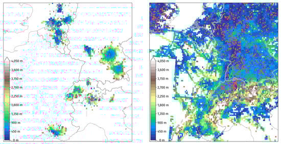 ADS-B coverage (minimal altitude detected) below 10,000 ft for aircraft with a non-commercial callsign over Western Europe (left) with mountain relief (right). Red dots match the location of receivers actively feeding the OpenSky Network on the same day.
