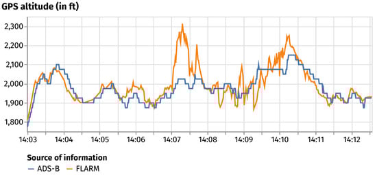 Figure 4 reflects the difference in philosophy between ADS-B and FLARM technologies: ADS-B is a surveillance technology where aircraft broadcast their current position; FLARM is a collision avoidance technology where aircraft estimate their future position. Reported GPS altitudes (FLARM only reports GPS altitude, using the metric system) may not match, as they do not represent the same estimation.