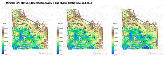 Figure 5 shows that on a relatively short time period and despite the lack of an extended network for FLARM data collection, traffic is very likely to operate at low altitudes (i.e., below 1200 feet AGL) over a large share of the covered area. The possibility of interference with VLL UAS operations cannot be ignored. The resolution of traffic data visualization is high enough (the grid creates 100 points per latitude and longitude degrees) to reveal local traffic patterns and to allow for a precise analysis of possible encounters along the planned UAS trajectory. The figure also confirms the complementarity of FLARM and ADS-B data: both technologies cover different types of traffic and different regions. Moreover, aircraft equipped with FLARM constitute a significant part of traffic at lower altitudes.