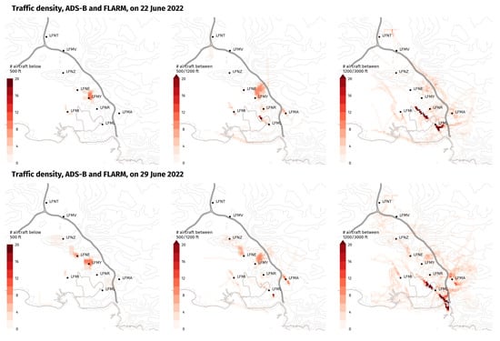 Figure 6 highlights the variation of traffic density with AGL altitude layers over the same day of two consecutive weeks. As expected, coverage below 500 feet is limited to the immediate surroundings of the receiver located at LFMY and only local traffic for take-off and landing is visible, together with some glider activity over the hills between LFNE and LFNZ. On the intermediate altitude layer (500 to 1200 feet), particularly relevant with regard to UAS operations, patterns of VFR traffic are visible even far from the receiver. More IFR traffic appears on the third layer. Discrepancies between the two days suggest that traffic density should be considered over time, rather than through a maximal or mean value.