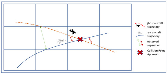 Closest Point of Approach (CPA) between two aircraft prior to an imminent collision between a real aircraft and a ghost aircraft based on an adaptation of CRM [13].