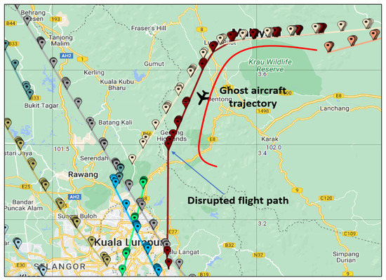 As in Figure 3, we created an attack scenario of a ghost aircraft trajectory interfering with the normal trajectory of an aircraft that has begun descending towards Kuala Lumpur International Airport (KLIA) from 1000 h until 1005 h on 6 January 2020. The ghost aircraft (red trajectory) was injected theoretically in the scneraio-based analysis nearby the Eastern border of the Lumpur TMA. When the ATC detected a possible collision, and after trying to verify the ghost aircraft but to no avail, the ATC would take standard preventive actions by alerting the legitimate aircraft and to slow the affected aircraft down and divert its route.
