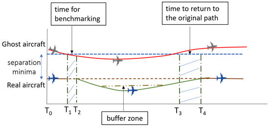 The main principle of our proposed framework is about constantly benchmarking the trajectory of the ghost aircraft. The tactical diversion adheres to a 6 nautical miles (6nm) lateral separation minima including a threshold of 1 nm buffer airspace. In the event of further incursion inwardly by the ghost trajectory, the tactical diversion will move further away from the ghost trajectory. At the time this event is happening, the separation minima is still more than or equal to 5 nm. The existence of buffer airspace is also meant to accommodate non-instantaneous processing by the aircraft’s pilot based on recommendations given by the framework. The concept of the proposed framework is as shown in Figure 4.