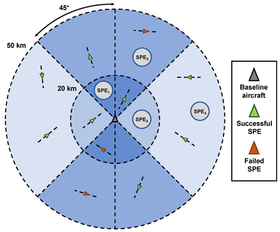 SPEs were ranked by significance from 1 to 4, as is visually represented in Figure 2. Under assumed plume conditions, horizontal plume radius rh is predicted to reach between 6 and 7 km at the 2 h threshold, whilst rv approaches a mere 75–100 m. SPE ranks were designed in such a way as to capture all instances where plumes from aircraft pairs are likely to overlap prior to the proposed 2 h threshold. SPE1 is classed as any aircraft that is within a 20 km proximity of the baseline aircraft, has a bearing within ±45° of the baseline track and also has a track that is within ±45° of the baseline track. For SPE2, the same rules on relative tracks apply; however, relative distance is between 20 and 50 km. SPE3 counts as any aircraft that is outside of the ±45° boundary, however is within 20 km. Relative headings were neglected here, as any aircraft crossing at such obtuse angles will likely experience plume overlap to some degree. Finally, SPE4 represents any aircraft that does not satisfy any of the other conditions, however is still within a 50 km radius of the baseline aircraft. The ranks were deduced based on relative distance and tracks between all aircraft pairs at every timestep, prioritising tracks over distance. This is because two aircraft flying a similar heading are extremely likely to experience significant and persistent plume overlap even if they are a large distance apart longitudinally. This is because aircraft travel at high speeds and trajectories tend not to deviate too far from their heading during the cruise segment of flight [28].