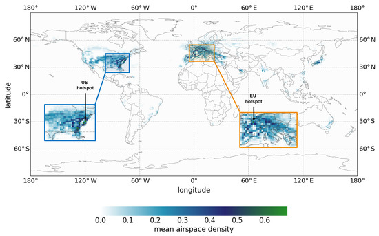 This study brought to light some interesting findings regarding plume overlap occurrences in real-world air traffic scenarios. Firstly, the results of the global analysis were plotted on a heatmap of mean airspace densities. This was subsequently overlaid onto a world map to allow for visual identification of geographical biases in aviation demand. Figure 3 shows the heatmap with magnification of the two overarching regions with the highest air traffic densities, the East Coast of the United States and Central Europe.
