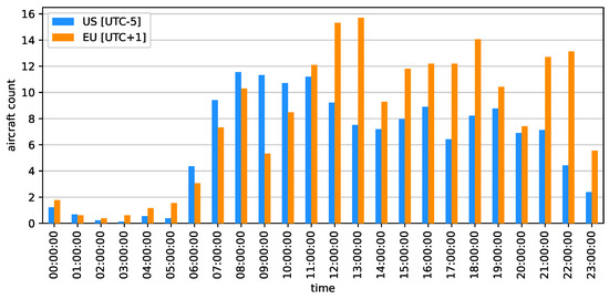 From these magnified regions, the two highest density grid cells were selected for a further subgrid-scale analysis. These were the United States (US) hot spot with a midpoint longitude of −76.5° and latitude of 36.5°, and the European (EU) hot spot at longitude 2.5° and latitude 49.5°. Again, both grid cells are at an altitude of 38,000 ft ± 500 ft. Before conducting the high resolution subgrid-scale study, it was first necessary to cherry-pick a suitable time interval to investigate, as running plume simulations over the entire month period was too computationally expensive. Instead, using trajectory data resampled at 1 min intervals, the average aircraft count for each hour of the day was calculated over the whole month, for each hot spot grid cell. The results can be seen in Figure 4.