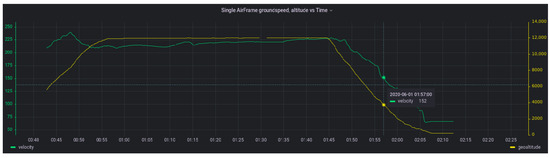 Listing 7 uses the Grafana global variables $__from:date and $__to:date to allow user inputs in the Grafana GUI. The flight_traj_asc table returns the period of the first sequence of each flight. This is done using atRange() to clip the temporal data to create ranges where vertrate is between [1, 20], which represents an ascending airframe. Function sequenceN selects the first of the generated sequences, which is takeoff, the first period an airframe ascends. Function atPeriod is used to return the period (start and end timestamp) of the takeoff sequence. For visualization purposes, the sequence arrays are unpacked in the final_output table using unnest(), which provides a series of discrete points that can be visualized in Grafana (Figure 5a,b). In Grafana, adjustments are made to have the marker size reflect altitude and the color represent vertical ascent rate. A manual override is added for the minimum and maximum vertrate values to make large values more visible. The results have a filter set on a per airframe basis, where a single airframe shows a short increased vertical ascent rate towards the end of the ascent period.