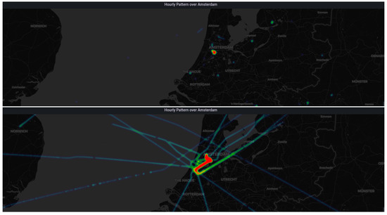 Heat map of Amsterdam air traffic from 10 h to 11 h (low traffic, top) and from 11 h to 12 h (high traffic, bottom).