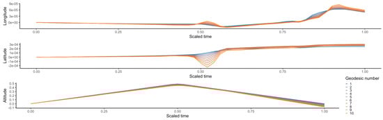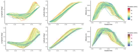 An adapted statistical framework to study trajectories is the one of Functional Data Analysis (FDA), popularized by [,]. Early promotion of FDA to study aircraft trajectories was made by []; it has been successfully used for Functional Principal Component Analysis (FPCA) by [] and applied to the detection of atypical energy behaviors by [].