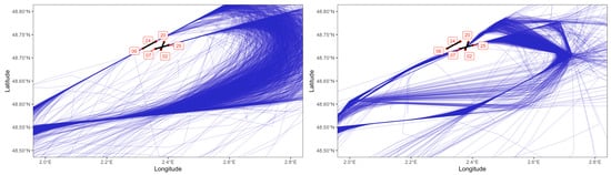 Linear interpolation of Eurocontrol trajectories (top) and ADS-B (bottom) versions for the flights departing from Toulouse–Blagnac (LFBO) and landing at Paris–Orly (LFPO) in 2019.