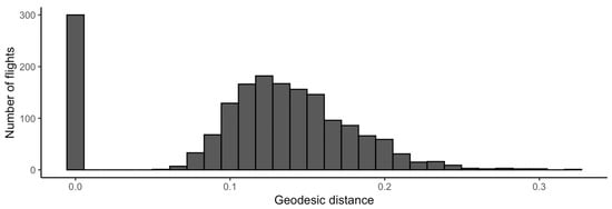 Histogram of the geodesic distances between Eurocontrol and ADS-B versions of the flights departing from Toulouse–Blagnac (LFBO) and landing at Paris–Orly (LFPO) in 2019.
