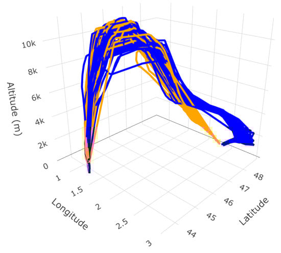 ADS-B data can be very noisy. Some basic filters are used to withdraw outliers. For instance, ADS-B flights with fewer than 20 points are withdrawn. ADS-B flights for which there is at least one time gap between two points that exceeds 20 min are withdrawn. A total of 5226 flights remain after the cleaning step.