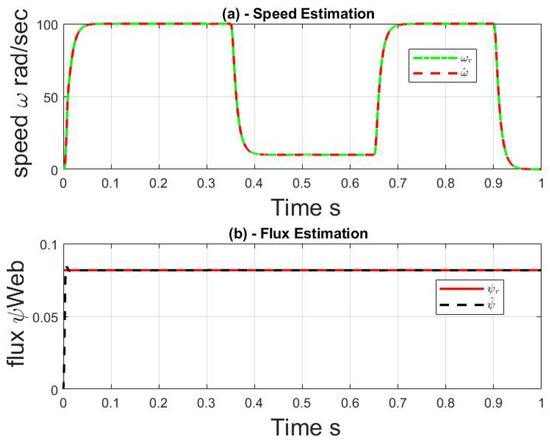 Note that the objective of the ADE strategy is to obtain proper estimation, minimize the total disturbance and obtain a good estimation of the flux and the speed. The ADE observer law is given by (7) and (8), where are design parameters chosen as described in Section 2. The observer uses the error between the actual measured flux and the estimated flux for correcting the estimated vector.