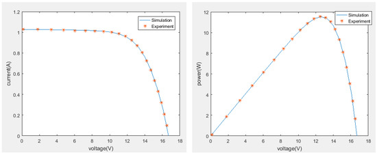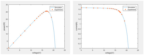 Using the identified parameters, the PV characteristics of the two modules were constructed and then compared with the experimental curves in Figure 7 and Figure 8.