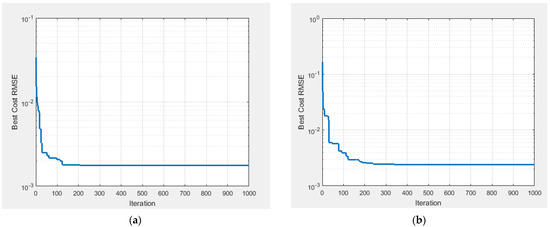 Convergence curve of the IOB-PSO for the (a) STM6−40/36 module (b) Photowatt-PWP201 module.