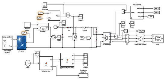 The global scheme present in Figure 1 shows the main parts dedicated to converting sun power to electrical energy. The use of PV allows the conversion to be achieved, and the system will be modeled.