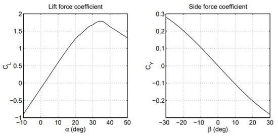 Typical lift force coefficient vs. angle of attack and side force coefficient vs. sideslip characteristics.
