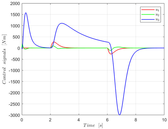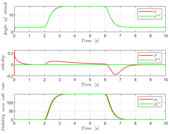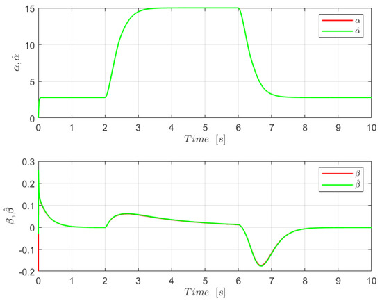 For the control law parameters were set for the backstepping approach and for the second equation of the observer, where and . Figure 3 illustrates the trajectory tracking simulation results for such an angle of attack, slideslip, and stability axis roll rate, and it is obvious that each of the latter variable graphs properly follows the prescribed path. Both and are shown in Figure 4 with their estimates, resulting in a perfect estimation of the observer chosen. For the control input, it is presented in Figure 5.