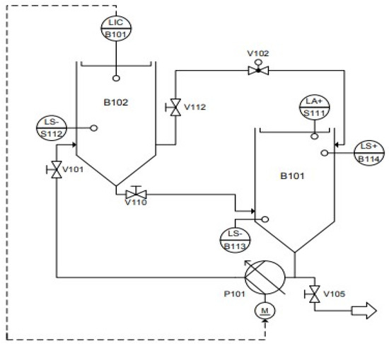 The FESTO Didactic station allows the realization of such a control system as: level, pressure, temperature and flow rate; in our case, the level control loop is used. The considered loop is shown in Figure 4. The process of the level control system is realized by the pump P101, that pumps liquid from tank B101 to tank B102 and the ultrasonic sensor located on the top of the tank B102. The measurement signal transmits the value of liquid in tank B102, and the correction is realized through an actuator signal which is the voltage applied to the pump. As is shown in Figure 4, the process admits a disturbance represented by manually opening/closing the valve V102 or the valve V110.