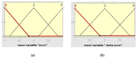 The membership functions for the inputs. (a) Error; (b) Delta error.