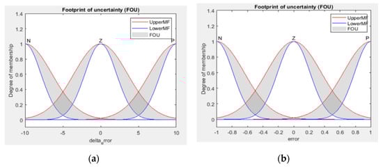 The Type 2 membership functions for the inputs. (a) Error; (b) Delta error.