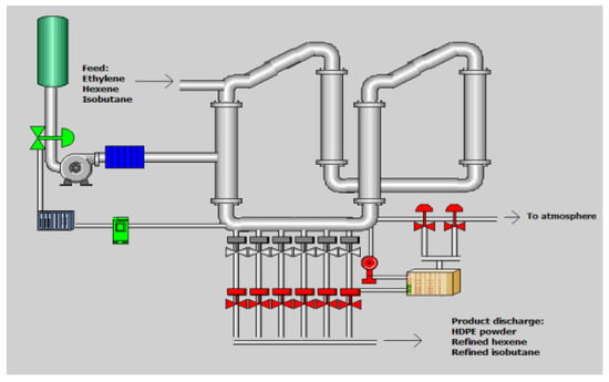 The reactor feed streams (ethylene, isobutane, hydrogen and 1-hexene, in the case of the production of copolymers) require a high degree of purity, for this; they are in advance treated to remove any catalyst poison (basically acetylene, oxygen, and water) until not harmful residual contents [7]. This is accomplished in suitable catalytic caterers, in the case of ethylene, degassing columns, isobutane and hexene-1, and specific dryers for all currents. The reactor is fed with the raw materials processed at the treatment area. Recycled isobutane, hydrogen, hexene-1 and ethylene arrive at the reactor through the main supply line to the reactor. Hexane and recycled isobutane are mixed in the static mixer isobutane/hexene. Hydrogen is mixed with the ethylene and it is added to the stream of recycled isobutane/hexene at the mixer output. The feed to reactor at different flows is adjusted based on certain variables. The isobutane-ethylene-polyethylene mixture flows into the reactor through the reactor pump [8].
