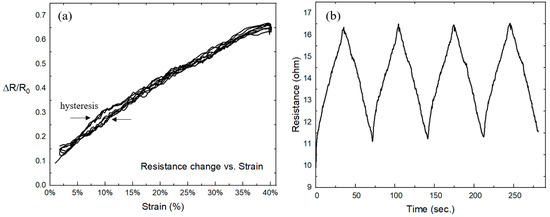 The developed knitted strain sensor graphs under four cyclic tests: (a) relative resistance change versus strain and (b) resistance versus time.