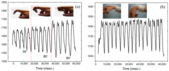 Bending the finger and wrist deforms the fabric, causing the sensor to change resistance. In this way, finger and wrist movements can be directly detected and monitored. Figure 4a shows the results of finger motion detection at different bending angles by the wrist-to-finger wearable system, targeted at 30°, 60° and 90°. This shows that with the increase in the bending angle of the finger joint from 30° to 60°, and then to 90°, the change in the relative resistance value increases. To investigate the wrist monitoring, the same test was applied to the wrist-to-finger wearable system, and the plot also provides distinguishable patterns in the flexed and unbent positions, as shown in Figure 4b. Note that tests were performed to demonstrate the effects, and the bending angles were not well controlled. However, the observed signal changes were seen to be measurable.