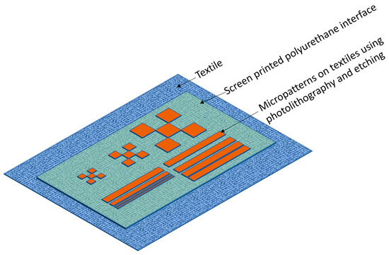 This study offers preliminary research into an approach that combines low-cost screen-printing with standard microfabrication processes to directly deposit and localize microcircuit patterns on textiles, minimizing integration challenges and benefiting the reliability and wearability of e-textiles. This method also ensures that micropatterns are not strained by the manufacturing process. The proposed e-textile shown in Figure 1 consists of a screen-printed polyurethane (PU) interface layer, which planarizes the textile surface and allows copper micropatterns to be deposited onto it through a combination of photolithography, thermal evaporation deposition and etching processes.