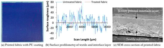 Figure 2 shows a 10 cm × 10 cm PU interface layer screen-printed onto the textile using a semi-automatic DEK248 screen-printer with the printing process described in [1]. The average printed PU thickness was 200 µm. The 2D surface topography of the printed textile obtained from a Tencor P11 surface profiler, as shown in Figure 2, clearly indicates a significant reduction in the average surface roughness of the textile from an initial value of 35 µm to 1 µm.