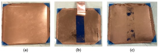 The printed fabric was metallized with 500 nm thick copper film using thermal evaporation deposition. A 10 nm thick chromium film was initially thermally deposited on the PU film to improve the adhesion of the copper film, as shown by the tape test in Figure 3.