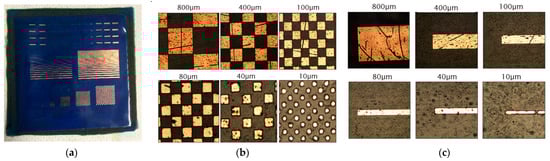 To pattern the fabric, a 6 µm-thick negative photoresist, AZ2070, was spin-coated and baked at 110 °C for 3 min before and after UV exposure through a mask containing the different patterns with feature sizes, line width and spacing ranging from 10 µm to 800 µm as shown in Figure 1. The exposed resist was developed for 75 s in AZ726 developer solution, rinsed in de-ionized water and etched for 10 s in ferric chloride (FeCl3) solution. Figure 4 shows the etched sample and the pattern resolutions achieved.