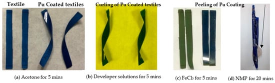Results comparing the various solvents demonstrate that they attack the PU coating, and this is especially noticeable in the lift-off process. N-Methyl-2-pyrrolidone (NMP), for example, severely degrades the PU coating after 20 min, as shown in Figure 5. The solvents for the etch process had minimal curling effect on the PU coating; hence, it was chosen for this work. For the wet stages of the lift-off and etching methods to be practical for micropatterning e-textiles, polymer friendly and gentle solvents are still required.